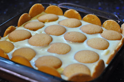 Next,in a 9x9 glass pan or similar, layer the desert in a cookie, pudding, banana slice fashion.